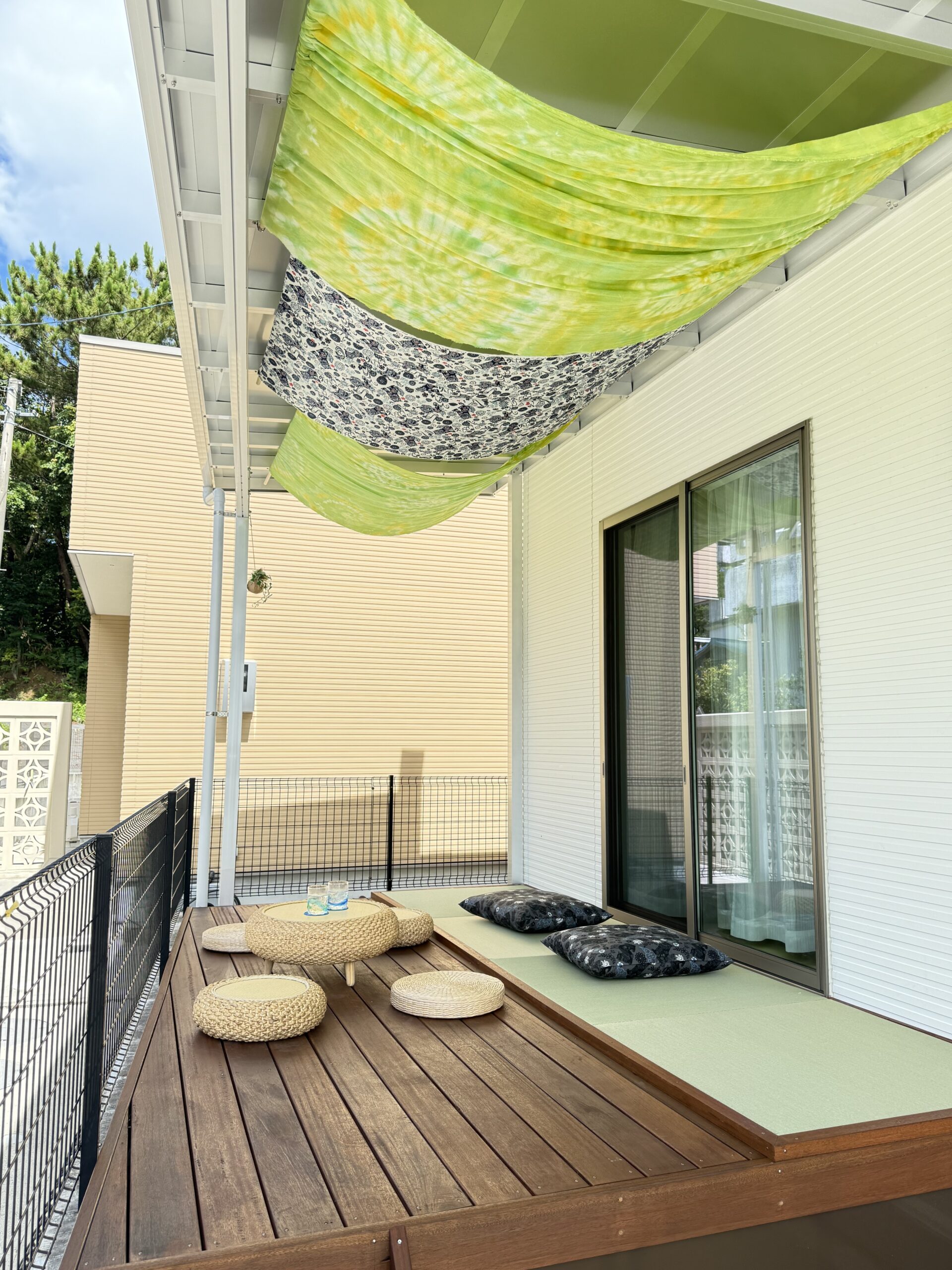 お知らせ ✴︎おしゃれテラス✴︎完成!! 2025.07.24(木) 外でもくつろげる空間が出来ました! 夏はちょっと暑そうですが、屋根も完備で突然の雨でも大丈夫です! ウッドデッキと畳のコラボでとても良い感じです。畳で使って頂ける座布団も用意しました!耳をすませば三線が聞こえることも〜!沖縄ののんびりとした時間をぜひ体験してみてください! 一覧に戻る TOPに戻る